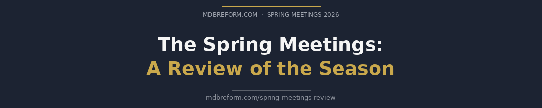 The Spring Meetings are a repertory theatre. The company is permanent. The institutional structure does not change between productions. What changes is the programme — the theme that gives each season its identity, its marketing campaign, its flagship reports, and its communiqué language.